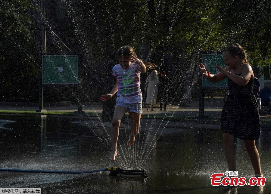 Children play with sprayed water during a hot summer day at the Moscow Zoo, in Moscow, Russia, July 12, 2021. (Photo/Agencies)