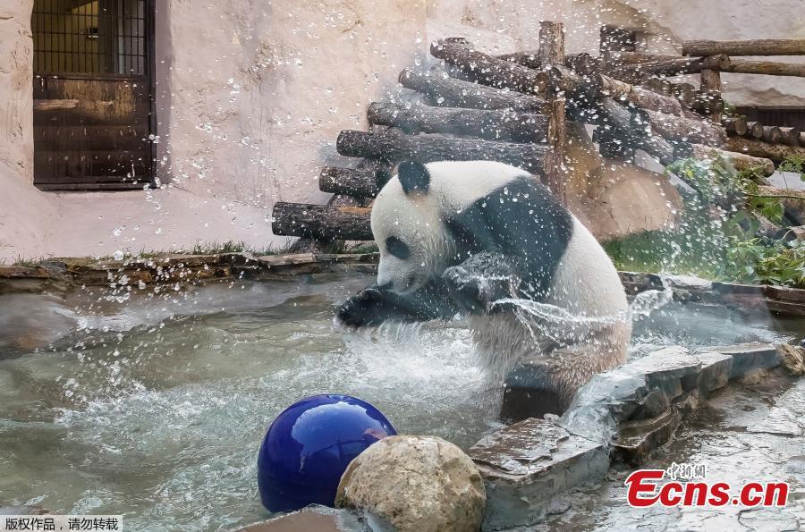 A giant panda cools off during a hot summer day in its enclosure at the Moscow Zoo, in Moscow, Russia, July 12, 2021. (Photo/Agencies)