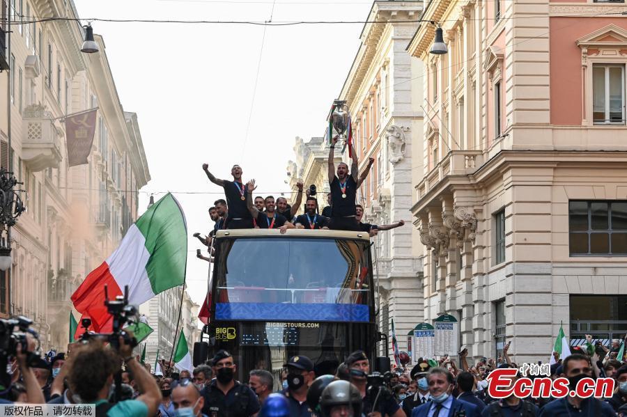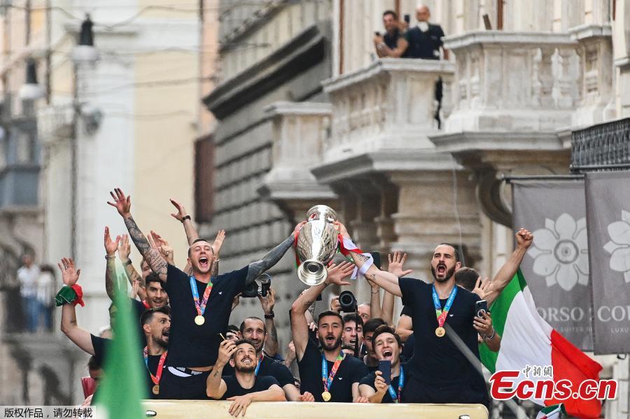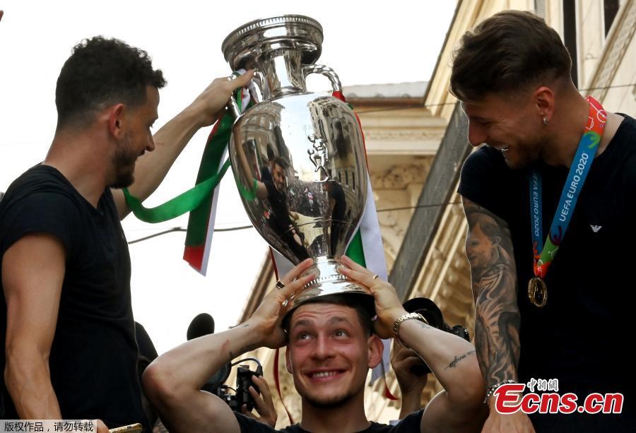 Players of Italy's national football team parade with the UEFA EURO 2020 trophy on a double decker bus on Via del Corso in Rome on July 12, 2021, a day after Italy won the UEFA EURO 2020 final football match between Italy and England. (Photo/Agencies)