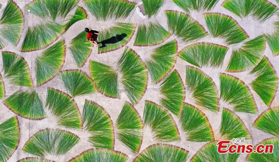 As the bumper harvest season came, local villagers put the mat grass in the shape of a fan to dry, forming a unique harvest scene. More than 2,000 mu (about 133 hectares) of mat grass was planted in Shuanggang Village. The dried mat grass will be made into daily necessities such as straw hats, cattail leaf fan, and straw baskets to help farmers increase their income.