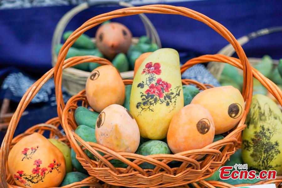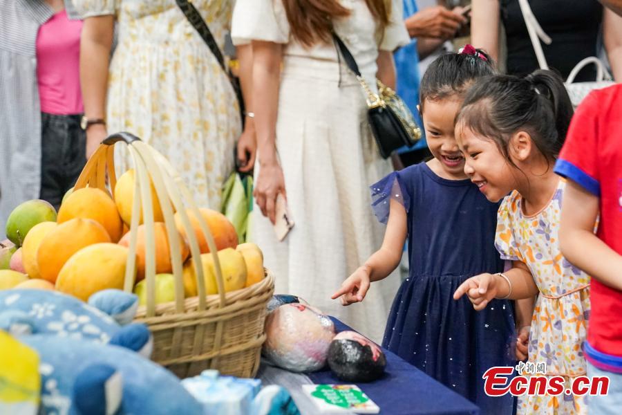An exhibition to celebrate the harvest of mango is held at the Tiandong Sports Center in Baise, Guangxi Zhuang autonomous region on July 18, 2021. More than 30 mango varieties were displayed at the exhibition on Sunday. (Photo/ Chen Guanyan)
