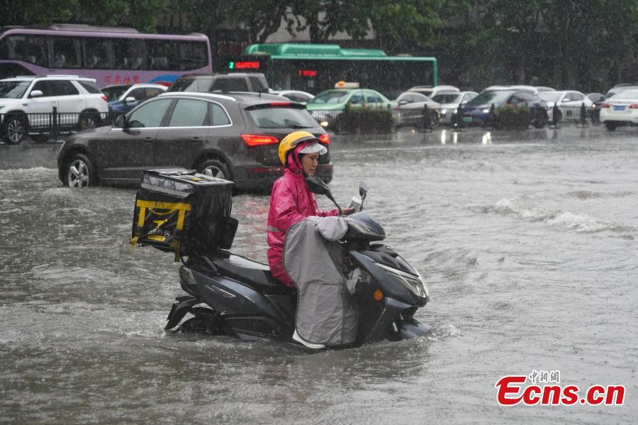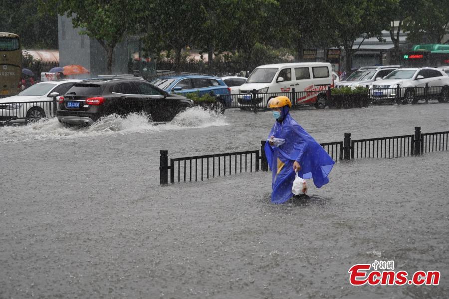 A deliveryman walks on a waterlogged road in Zhengzhou, capital of central China's Henan Province, July 20, 2021. (Photo: China News Service/ Li Chaoqing)