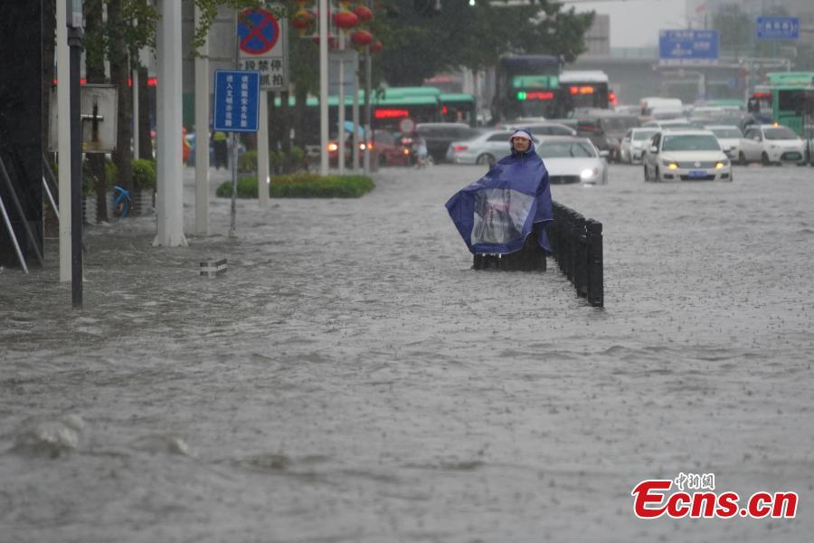 A resident wades through a waterlogged road in Zhengzhou, capital of central China's Henan Province, July 20, 2021. (Photo: China News Service/ Kan Li)