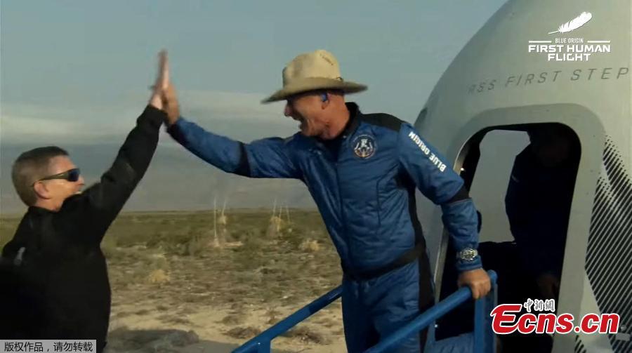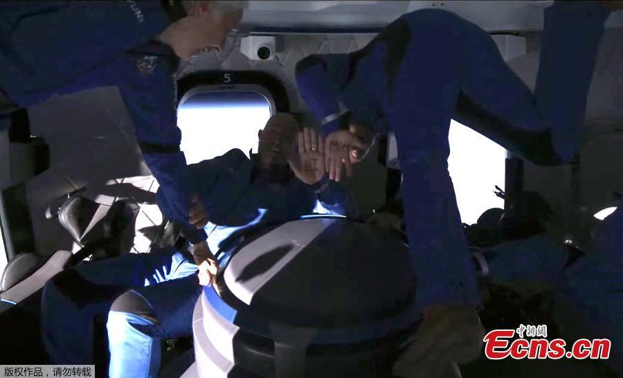 Jeff Bezos catches up a pop-corn in weightlessness during his first space journey, July 20, 2021. Bezos, 57-year-old American billionaire and CEO of Amazon. com Inc, took his company Blue Origin's New Shepard launch vehicle successfully and returned safely on Tuesday. Three other people including Jeff's brother Mark Bezos were also on this space trip. (Photo/ Agencies)