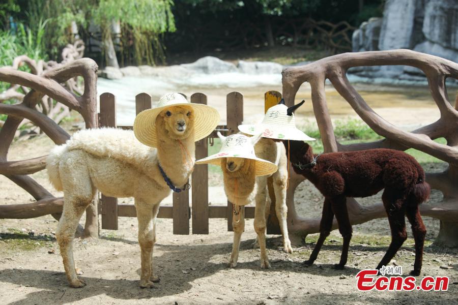People are attracted by the alpaca wearing a straw hat in the Yancheng Wild Animal World, Changzhou, Jiangsu Province, July 20, 2021. The zoo provides a cool spa and icy foods for animals to stay cool in the summer days. (Photo/ Chen Yiting)