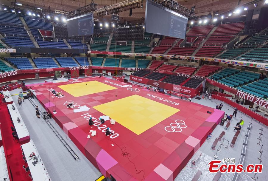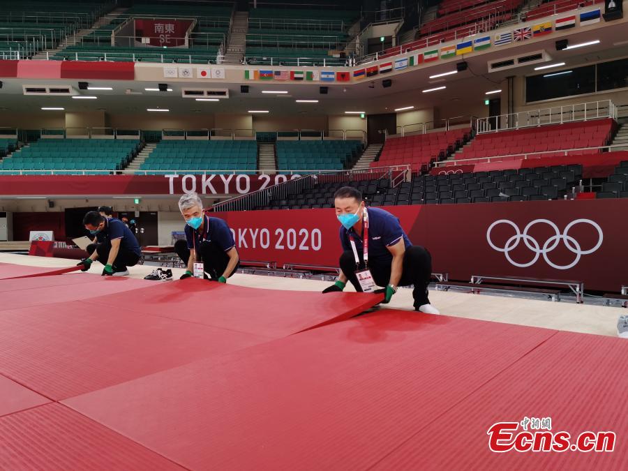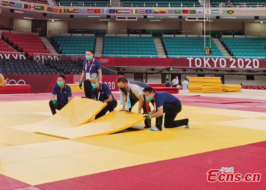 A service support team for the Tokyo Olympics manages the Judo facilities in the Nippon Budokan (or the martial art hall in English), Tokyo, Japan, July 20, 2021. (Photo by China News Service/ Wu Rina)