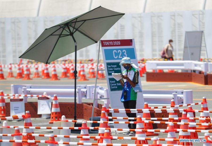 A staff member works at a transport site in Tokyo, Japan, July 21, 2021. The opening ceremony of Tokyo 2020 Olympic Games will be held on Friday. (Xinhua/Zheng Huansong)
