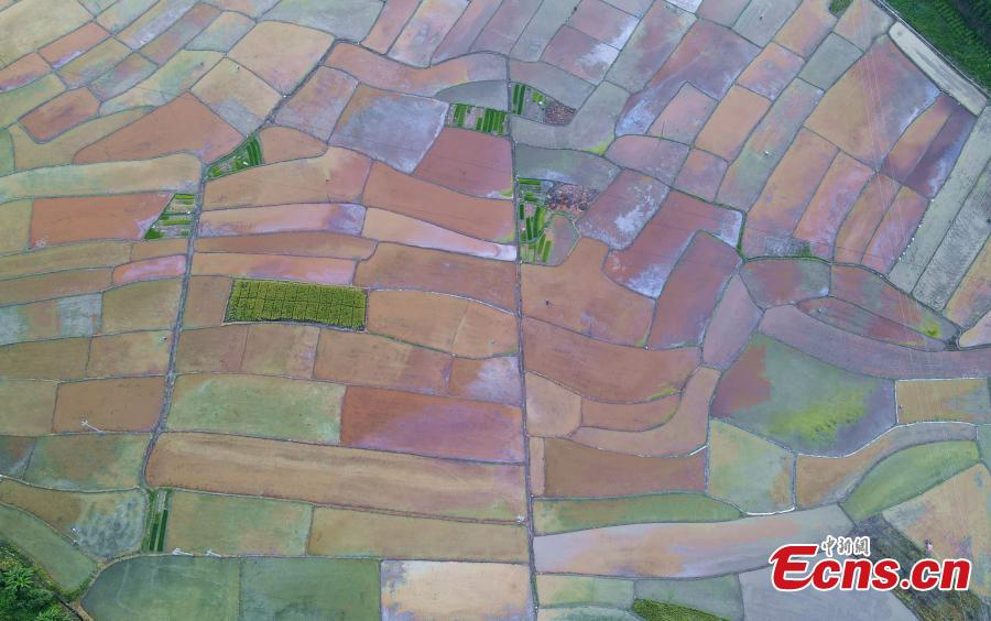 Undated photo shows rice fields look poetic when sunset falls in Shangsi County, China's Guangxi Zhuang Autonomous Region. (Photo by China News Service/ Wei Shixian)