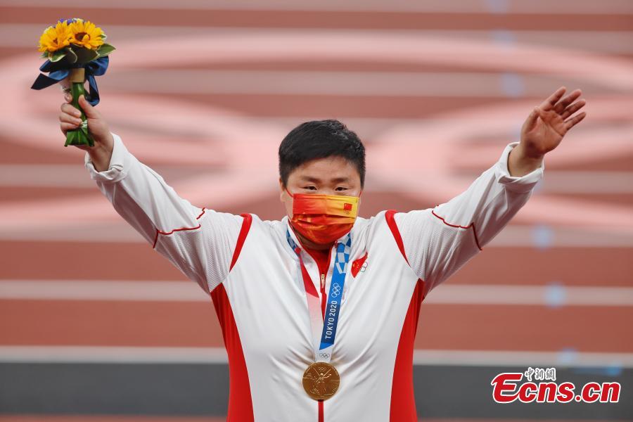 Gong Lijiao of China waves on the podium during the awarding ceremony for women's shot put at Tokyo Olympics in Tokyo, Japan, Aug. 1, 2021. (Photo: China News Service/ Fu Tian)