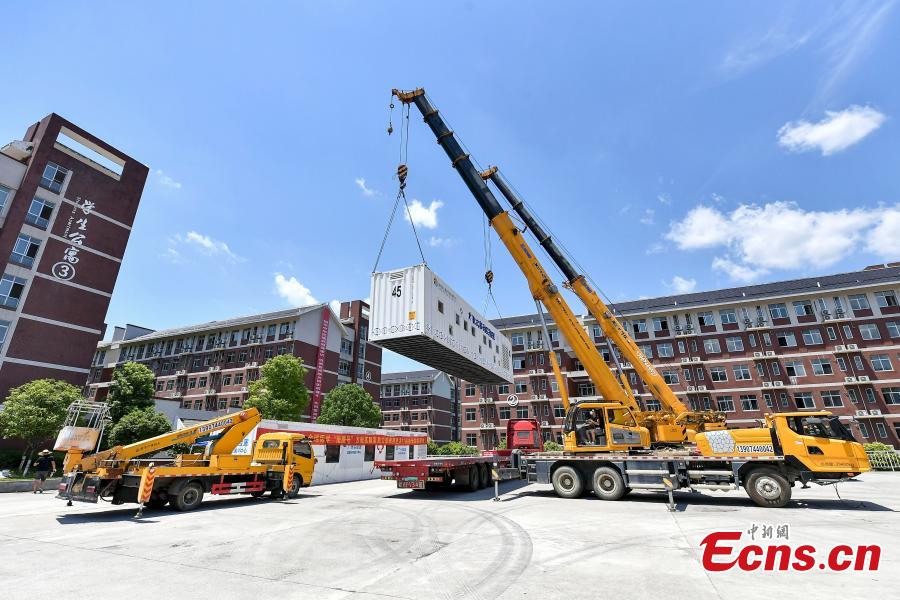 This photo shows cranes carry the mobile cabin PRC rapid detection laboratories mobile cabin PRC rapid detection laboratories.(Photo/Shao Ying)