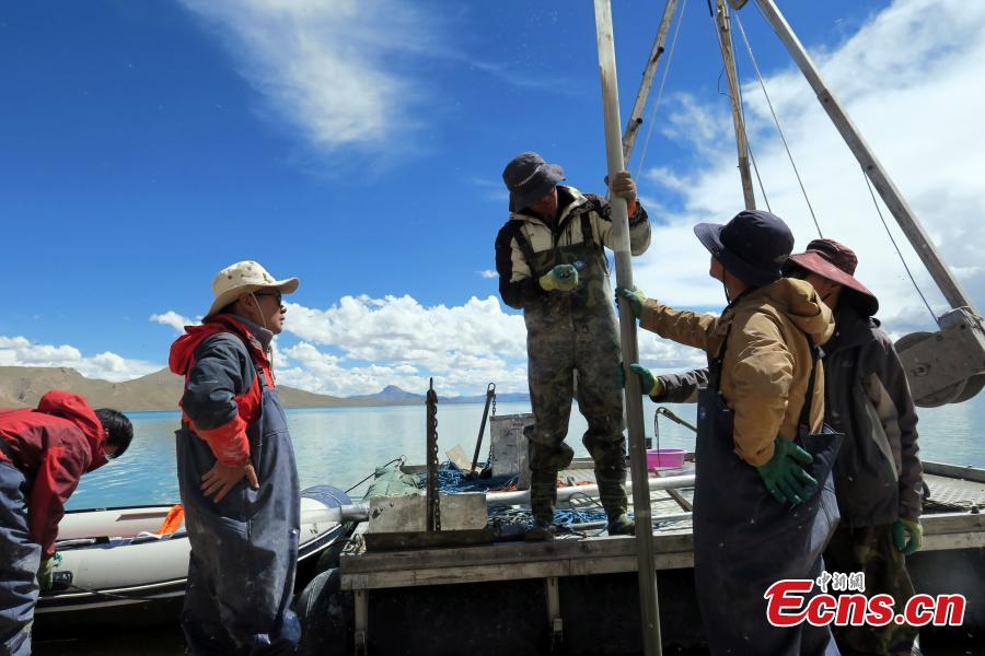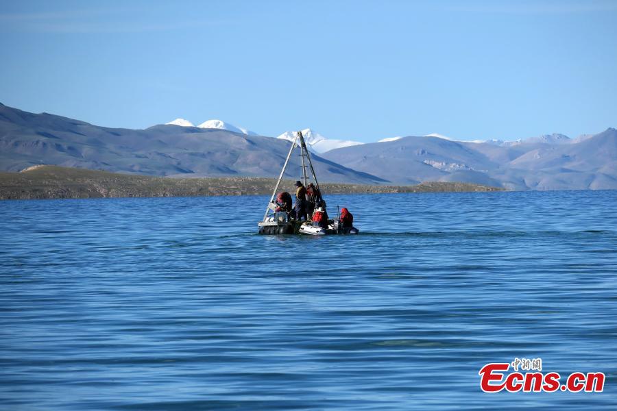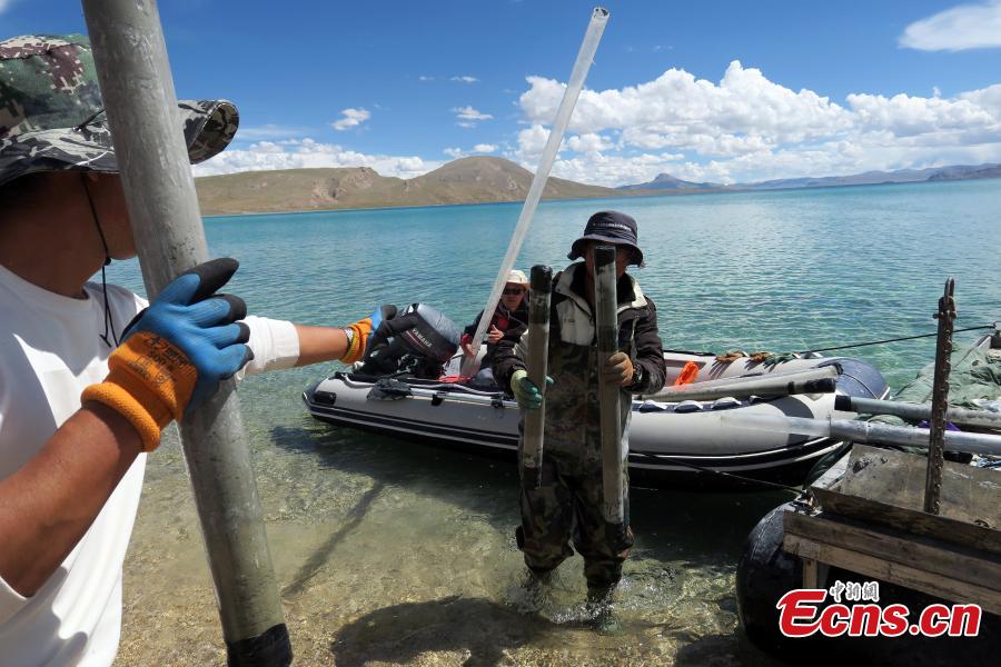 A research team of the second comprehensive scientific expedition on the Qinghai-Tibet Plateau completed a scientific survey on Sunday at the plateau lake Co Ngoin Lake, which is at an altitude of 4,500 meters in Xainza County, in Tibet Autonomous Region. The team collected research samples such as lakebed long core and lake sediments through the lake drilling platforms and gravity drill samplers. The samples can date back as far as 40,000 years.