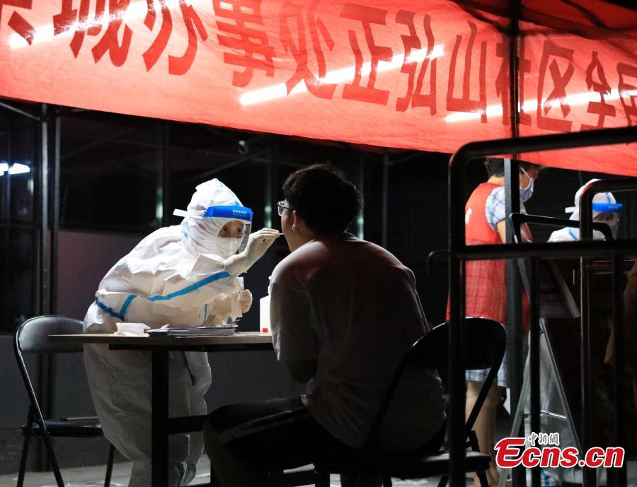 Medical workers collect swab sample from a resident for COVID-19 nucleic acid testing in Zhengzhou, Henan province, in the small hours of Aug 2, 2021. (Photo: China News Service/Kan Li)