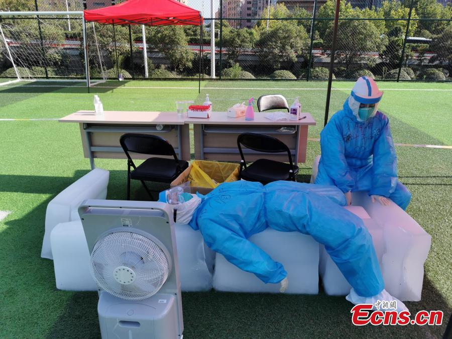 Medical workers in protective suits enjoy the cool summer by holding ice in an outdoor sampling site undertaken by Henan Cancer Hospital in Zhengzhou, Henan province, Aug 2, 2021. (Photo/Han Zhangyun)