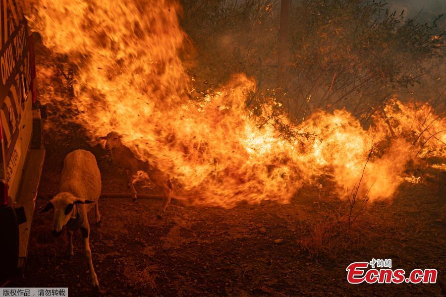A sheep is covered with flammes coming from an advancing fire on Aug. 2, 2021 in Mugla, Marmaris district, as the European Union sent help to Turkey and volunteers joined firefighters in battling a week of violent blazes that have killed eight people. (Photo/Agencies)