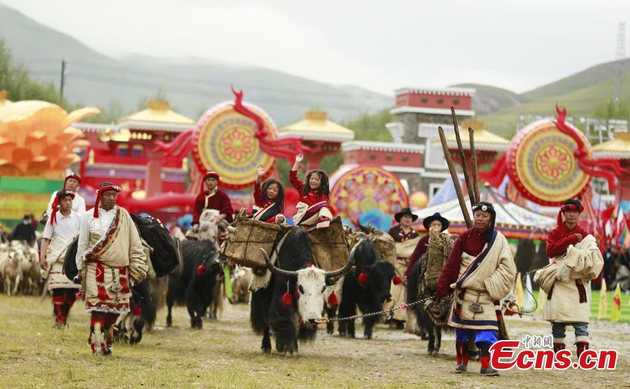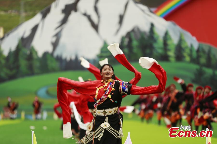 Local residents tell the story of herdsmen's relocation in their performance during a celebration marking the 70th anniversary of the founding of Yushu Tibetan Autonomous Prefecture in northwest China's Qinghai Province, Aug. 4, 2021. (Photo: China News Service/Ma Mingyan)