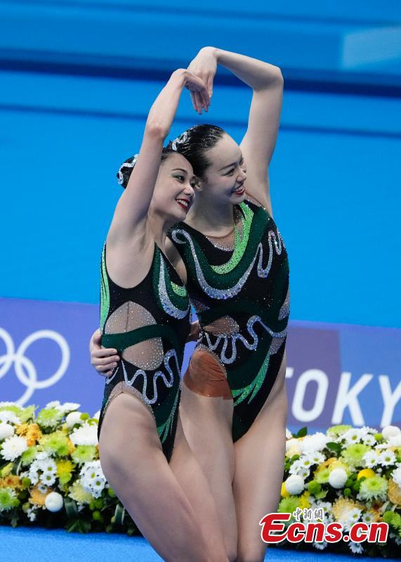 Huang Xuechen and Sun Wenyan compete during the artistic swimming duet free routine final at the Tokyo 2020 Olympic Games in Tokyo, Japan, Aug. 4, 2021. (Photo: China News Service/Han Haidan)