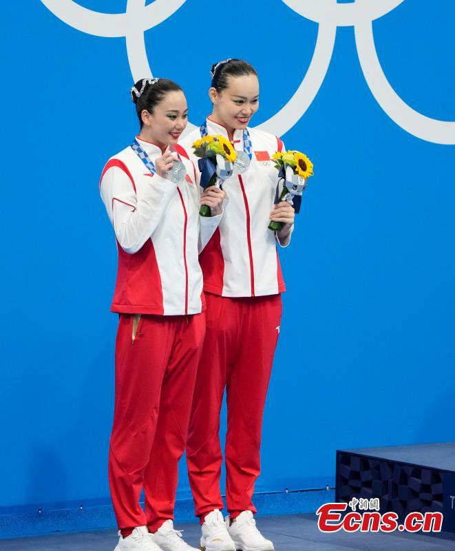 Huang Xuechen and Sun Wenyan attend the awarding ceremony for the artistic swimming duet at the Tokyo 2020 Olympic Games in Tokyo, Japan, Aug. 4, 2021. (Photo: China News Service/Du Yang)