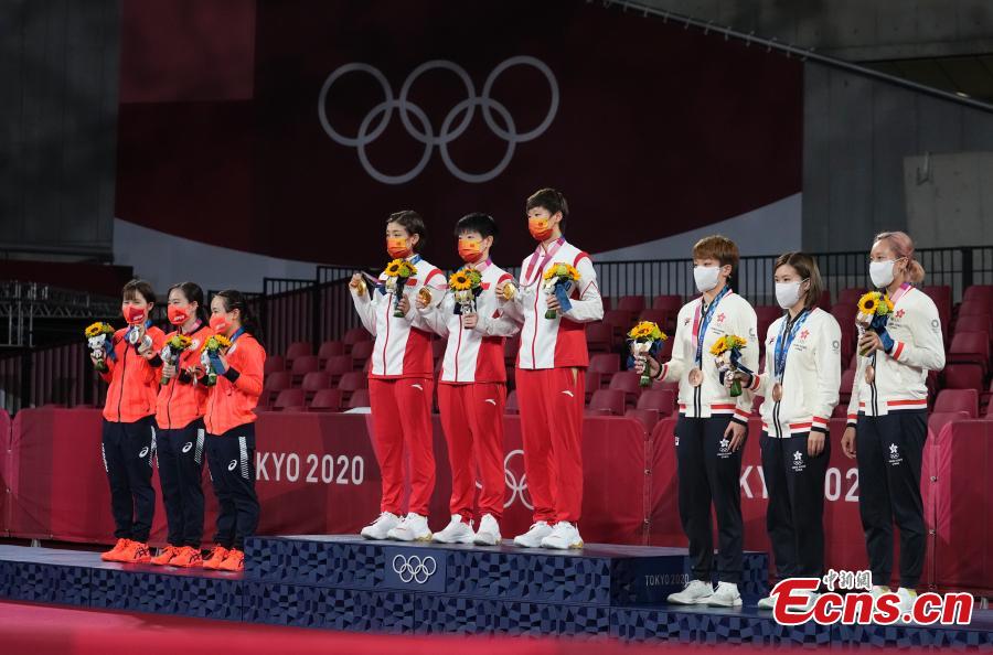 Team China, Team Japan and Team China's Hong Kong attend the awarding ceremony for the table tennis women's team event at the Tokyo 2020 Olympic Games in Tokyo, Japan, Aug. 5, 2021. (Photo: China News Service/Du Yang)