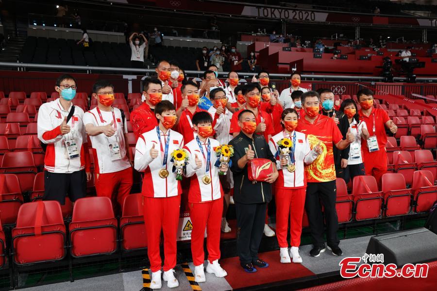 Team China pose for group photos after the awarding ceremony at the Tokyo 2020 Olympic Games in Tokyo, Japan, Aug. 5, 2021. (Photo: China News Service/Han Haidan)