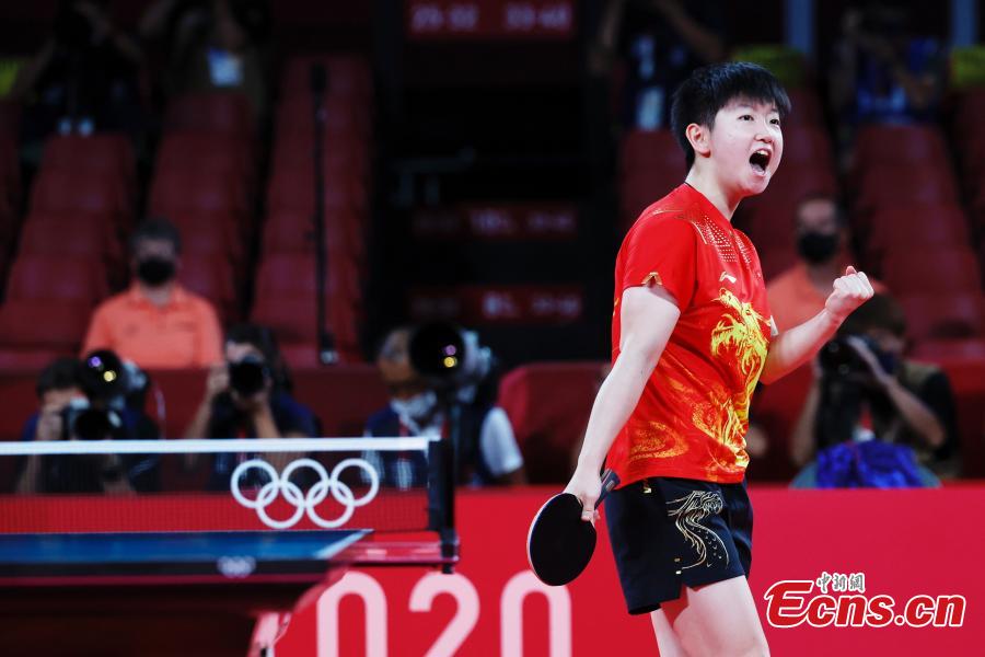 Sun Yingsha reacts during the table tennis women's team gold medal match between China and Japan at the Tokyo 2020 Olympic Games in Tokyo, Japan, Aug. 5, 2021. (Photo: China News Service/Han Haidan)