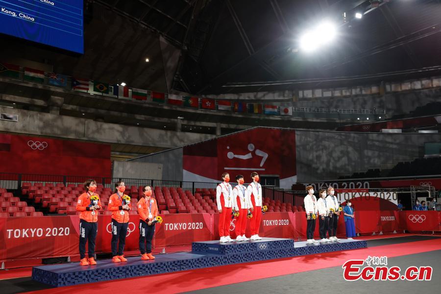 Team China, Team Japan and Team China's Hong Kong attend the awarding ceremony for the table tennis women's team event at the Tokyo 2020 Olympic Games in Tokyo, Japan, Aug. 5, 2021. (Photo: China News Service/Han Haidan)