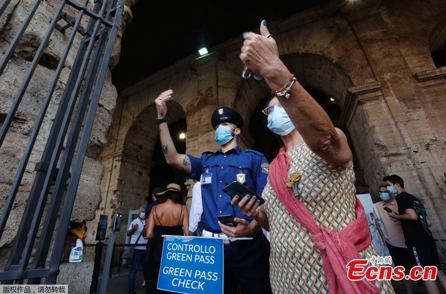 Photo released on August 9 shows a woman demonstrates the green pass to the staff in Rome, Italy. The country has rolled out the Green Pass since Friday, which requires people aged 12 and above to present the green pass when they enter museums, theaters, gyms, and other gathering places. (Photo/ Agencies)