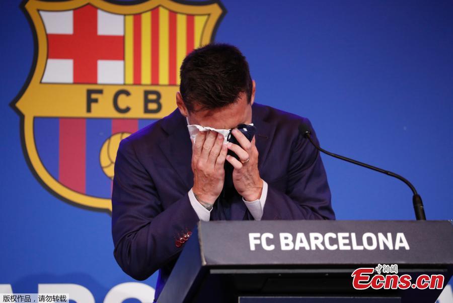 Argentine footballer Lionel Messi bursts into tears at the press conference to farewell the FC Barcelona at the Camp Nou Stadium in Barcelona, Spain on August 8, 2021. (Photo/ Agencies)