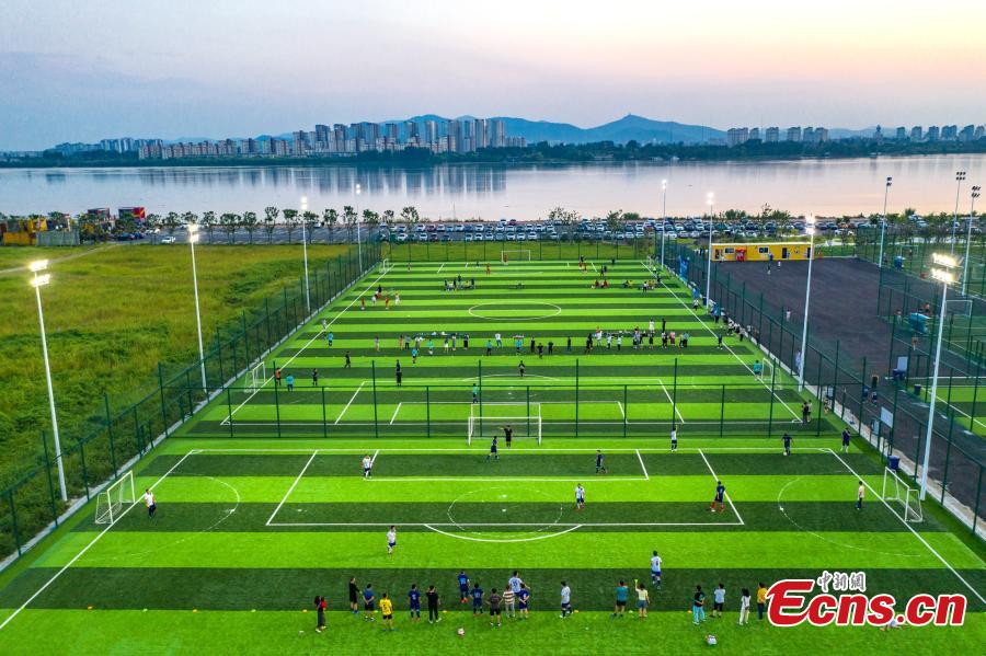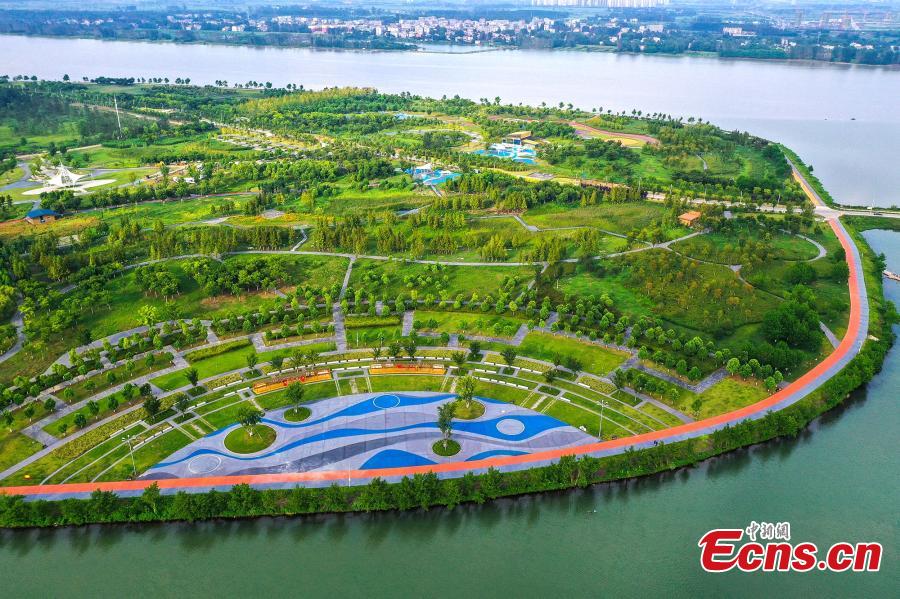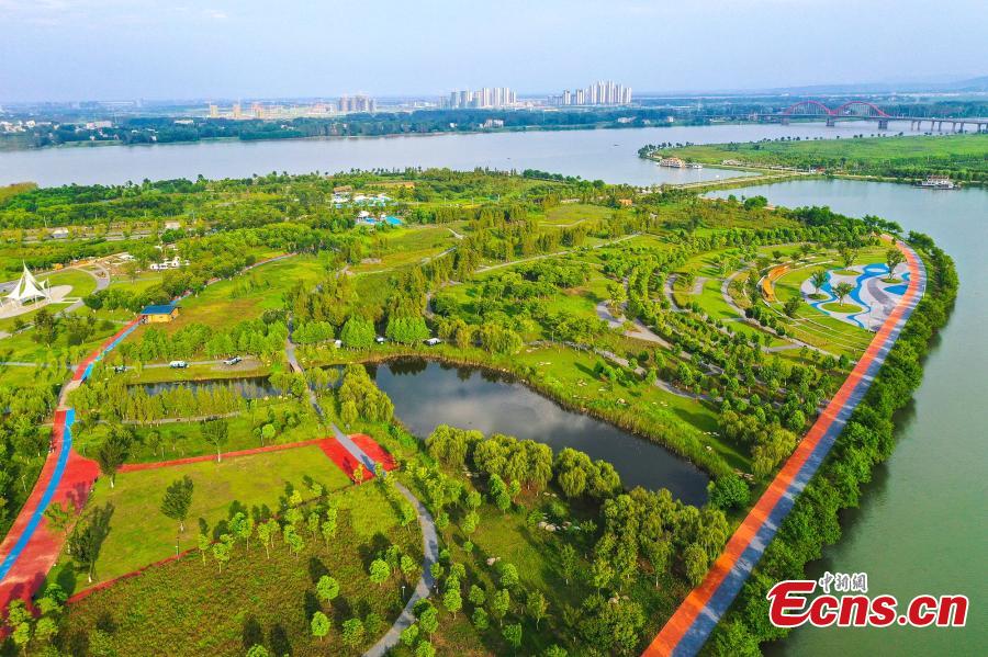 Yuliangzhou, an economic development zone in the central of Xiangyang City, is planted with lawn and green trees, Xiangyang, Hubei Province, August 10, 2021. (Photo/ Yang Dong)