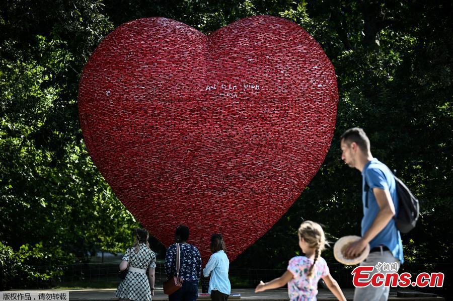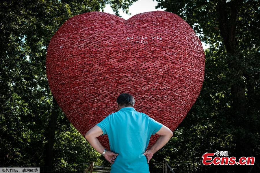 People stop to look at the heart-shaped artwork created by Italian-Belgian artist Alfredo Longo in a public park in Bordeaux, south-western France, on August 10, 2021. The artpiece is made with recycled aluminum cans, aiming to raise people's awareness about climate change. (Photo/ Agencies)
