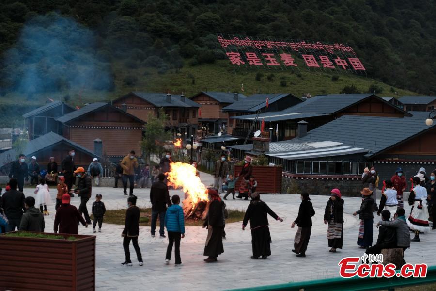 Villagers gather to dance "Guozhuang", a traditional Tibetan bonfire dance, in Yumai Township in Shannan, southwest China's Tibet Autonomous Region, at dusk. (Photo: China News Service/Jiang Feibo)