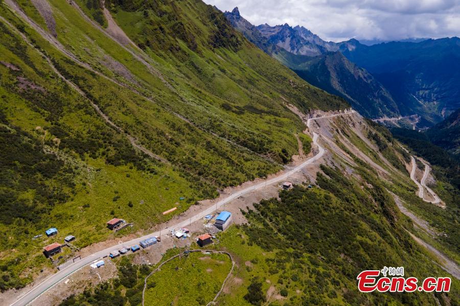 Aerial photo taken in August 2021 shows a winding road on a mountain at about 5,000 meters above sea level before entering Yumai Township in Shannan, southwest China's Tibet Autonomous Region. (Photo: China News Service/Jiang Feibo)