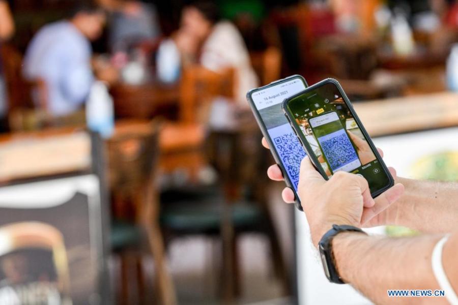A restaurant worker scans the QR code to check up the document confirming that the visitor has been vaccinated against COVID-19 in Skopje, North Macedonia, Aug. 16, 2021. (Photo by Tomislav Georgiev/Xinhua)