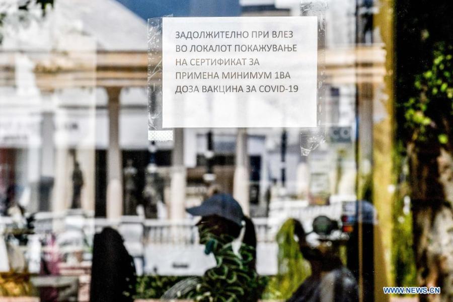 Photo taken on Aug. 16, 2021 shows a sign on a restaurant door informing that only people vaccinated against COVID-19 can enter the restaurant in Skopje, North Macedonia. (Photo by Tomislav Georgiev/Xinhua)