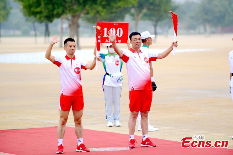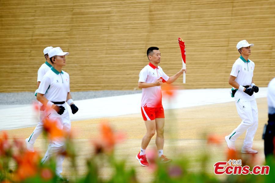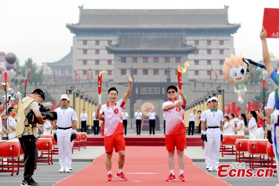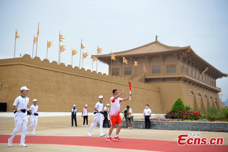 Torchbearers arrive at Danfeng Gate Square in Daming Palace National Heritage Park in Xi'an, Shaanxi Province, August 16,2021.