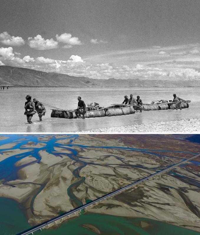 Combo photo shows boats made from cowhide carrying grain and products on the Yarlung Zangbo River in 1950s (up, photo taken by Zhao Qi) and a grand bridge over the Yarlung Zangbo River in Zhanang County of Shannan City, southwest China's Tibet Autonomous Region, Dec. 11, 2016 (bottom, photo taken by Purbu Zhaxi). On May 23, 1951, the Agreement of the Central People's Government and the Local Government of Tibet on Measures for the Peaceful Liberation of Tibet (17-Article Agreement) was signed, officially proclaiming the peaceful liberation of Tibet. The year 2021 marks the 70th anniversary of the historic event. (Xinhua)