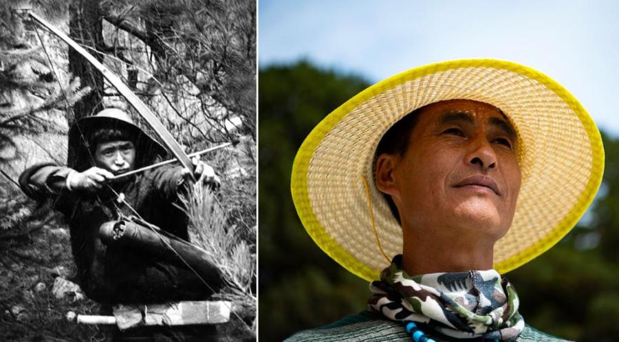 Combo photo shows hunter Daqian of Qionglin Village in 1950s (L, file photo) and Daji, a former hunter, working as a farmer and forest ranger now in Qionglin Village of Mainling County in Nyingchi, southwest China's Tibet Autonomous Region, June 19, 2021 (R, photo taken by Jigme Dorje). On May 23, 1951, the Agreement of the Central People's Government and the Local Government of Tibet on Measures for the Peaceful Liberation of Tibet (17-Article Agreement) was signed, officially proclaiming the peaceful liberation of Tibet. The year 2021 marks the 70th anniversary of the historic event. (Xinhua)
