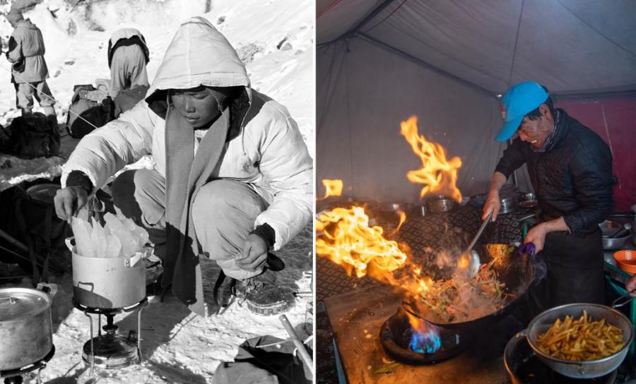 In this combo photo, the left part taken by Chen Zonglie shows Chinese mountaineers boiling ice at a camping site at an altitude of 5,700 meters in 1960s, and the right part taken by Sun Fei shows a staff member cooking in the advance camp at an altitude of 6,500 meters in southwest China's Tibet Autonomous Region, May 10, 2020. On May 23, 1951, the Agreement of the Central People's Government and the Local Government of Tibet on Measures for the Peaceful Liberation of Tibet (17-Article Agreement) was signed, officially proclaiming the peaceful liberation of Tibet. The year 2021 marks the 70th anniversary of the historic event. (Xinhua)