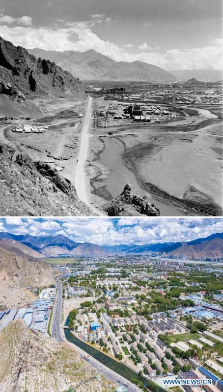 In this combo photo, the upper part taken by Lan Zhigui in the 1960s and the lower part taken by Purbu Zhaxi on Aug. 9, 2021 shows views of the west suburbs of Lhasa, southwest China's Tibet Autonomous Region. On May 23, 1951, the Agreement of the Central People's Government and the Local Government of Tibet on Measures for the Peaceful Liberation of Tibet (17-Article Agreement) was signed, officially proclaiming the peaceful liberation of Tibet. The year 2021 marks the 70th anniversary of the historic event. (Xinhua)