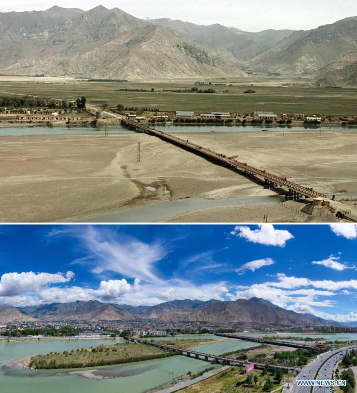 Combo photo shows a view of Bayi Town in Nyingchi, southwest China's Tibet Autonomous Region in the 1990s (up, taken by Chen Xie) and on July 20, 2021(bottom, taken by Purbu Zhaxi) respectively. On May 23, 1951, the Agreement of the Central People's Government and the Local Government of Tibet on Measures for the Peaceful Liberation of Tibet (17-Article Agreement) was signed, officially proclaiming the peaceful liberation of Tibet. The year 2021 marks the 70th anniversary of the historic event. (Xinhua)