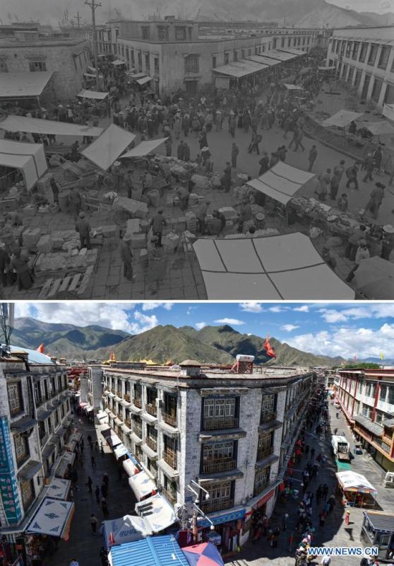 In this combo photo, the upper part taken by Wang Chunde in the 1950s and the lower part taken by Chogo on Aug. 13, 2021 shows views of Barkhor Street in Lhasa, southwest China's Tibet Autonomous Region. On May 23, 1951, the Agreement of the Central People's Government and the Local Government of Tibet on Measures for the Peaceful Liberation of Tibet (17-Article Agreement) was signed, officially proclaiming the peaceful liberation of Tibet. The year 2021 marks the 70th anniversary of the historic event. (Xinhua)