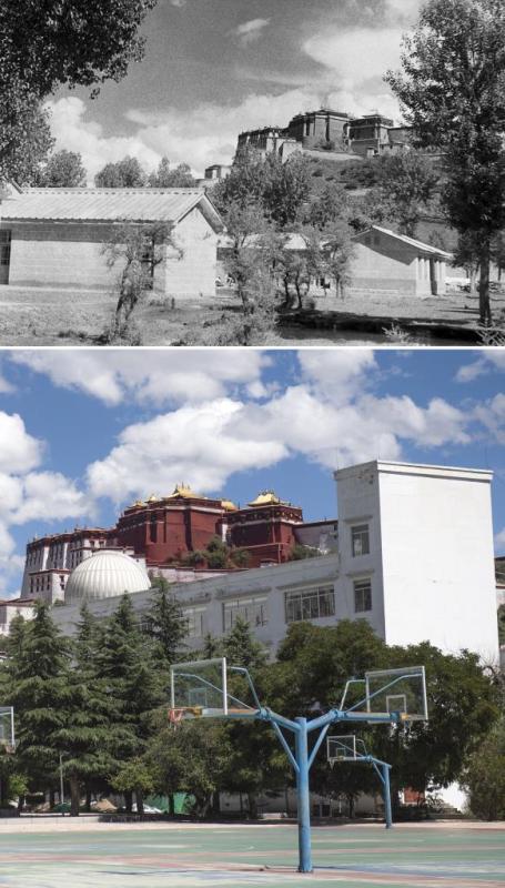 Combo photo shows a view of Lhasa Middle School in Lhasa, southwest China's Tibet Autonomous Region in the 1950s (up, taken by Jing Jiadong) and on Aug. 9, 2021(bottom, taken by Sun Ruibo) respectively. On May 23, 1951, the Agreement of the Central People's Government and the Local Government of Tibet on Measures for the Peaceful Liberation of Tibet (17-Article Agreement) was signed, officially proclaiming the peaceful liberation of Tibet. The year 2021 marks the 70th anniversary of the historic event. (Xinhua)