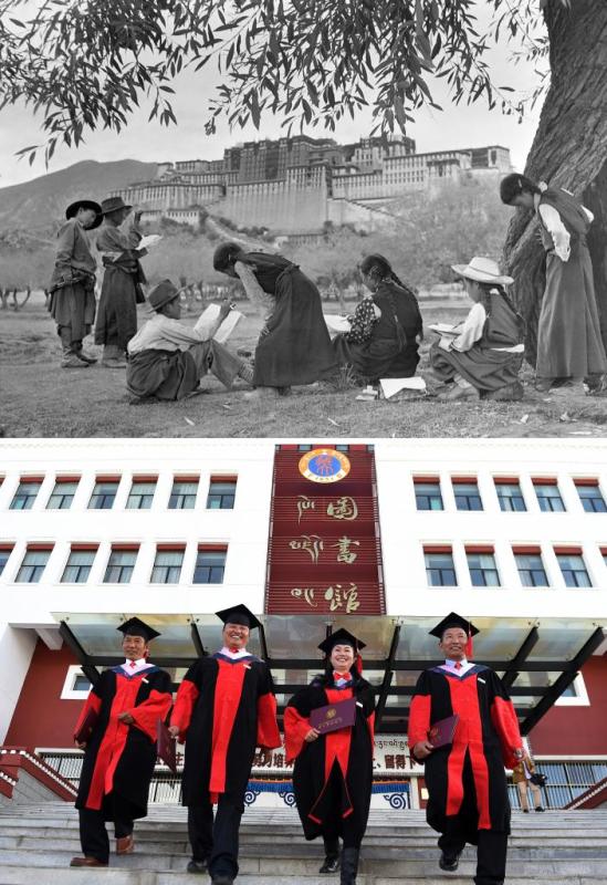 In this combo photo, the upper part taken by Ren Yongzhao shows primary school students practicing drawing in front of the Potala Palace in the 1950s; and the lower part taken by Chogo on Nov. 10, 2017 shows doctorate holders who were indigenously cultivated in southwest China's Tibet Autonomous Region. On May 23, 1951, the Agreement of the Central People's Government and the Local Government of Tibet on Measures for the Peaceful Liberation of Tibet (17-Article Agreement) was signed, officially proclaiming the peaceful liberation of Tibet. The year 2021 marks the 70th anniversary of the historic event. (Xinhua)