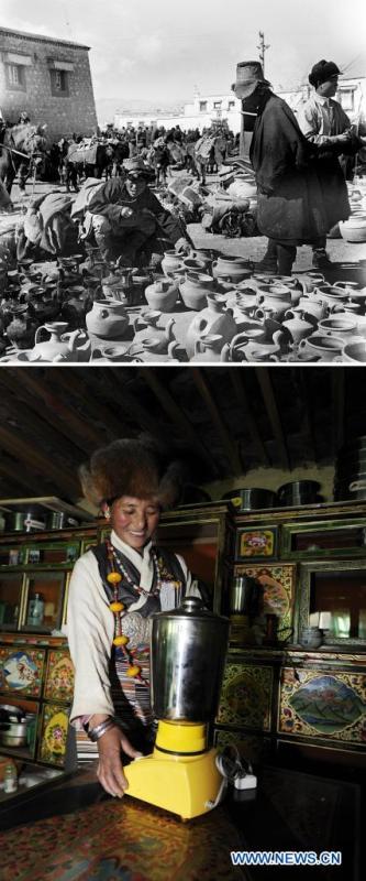 In this combo photo, the upper part taken by Ren Yongzhao shows residents buying tea kettles in Lhasa in the 1950s; and the lower part taken by Purbu Zhaxi on Dec. 12, 2011 shows a villager using a blender to make butter tea for her family in Xigaze, southwest China's Tibet Autonomous Region. On May 23, 1951, the Agreement of the Central People's Government and the Local Government of Tibet on Measures for the Peaceful Liberation of Tibet (17-Article Agreement) was signed, officially proclaiming the peaceful liberation of Tibet. The year 2021 marks the 70th anniversary of the historic event. (Xinhua)