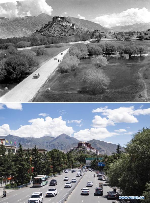 In this combo photo, the upper part taken by Ren Yongzhao shows vehicles running on a suburban road toward the Potala Palace in the 1950s, and the lower part taken by Zhang Rufeng shows vehicles running on a street toward the Potala Palace on Aug. 9, 2021 in Lhasa, southwest China's Tibet Autonomous Region. On May 23, 1951, the Agreement of the Central People's Government and the Local Government of Tibet on Measures for the Peaceful Liberation of Tibet (17-Article Agreement) was signed, officially proclaiming the peaceful liberation of Tibet. The year 2021 marks the 70th anniversary of the historic event. (Xinhua)