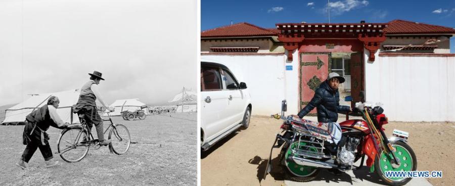 In this combo photo, the left part taken by Basang shows a herdsman learning to ride a bicycle in Nyainrong County in 1980s; and the right part taken by Chogo on Feb. 23, 2017 shows a youngster posing with a motorcycle in Nyainrong County, Nagqu, southwest China's Tibet Autonomous Region. On May 23, 1951, the Agreement of the Central People's Government and the Local Government of Tibet on Measures for the Peaceful Liberation of Tibet (17-Article Agreement) was signed, officially proclaiming the peaceful liberation of Tibet. The year 2021 marks the 70th anniversary of the historic event. (Xinhua)