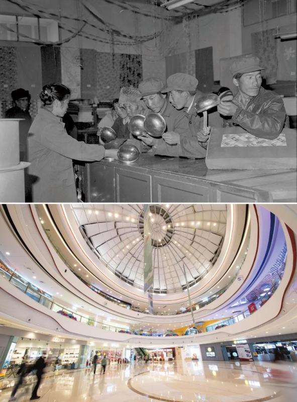 In this combo photo, people buy goods at a shop in 1980s (up, photo taken by Liu Lijia), and people visit the Wanda Shopping Mall in Lhasa, southwest China's Tibet Autonomous Region, Aug. 15, 2021 (bottom, photo taken by Sun Fei). On May 23, 1951, the Agreement of the Central People's Government and the Local Government of Tibet on Measures for the Peaceful Liberation of Tibet (17-Article Agreement) was signed, officially proclaiming the peaceful liberation of Tibet. The year 2021 marks the 70th anniversary of the historic event. (Xinhua)