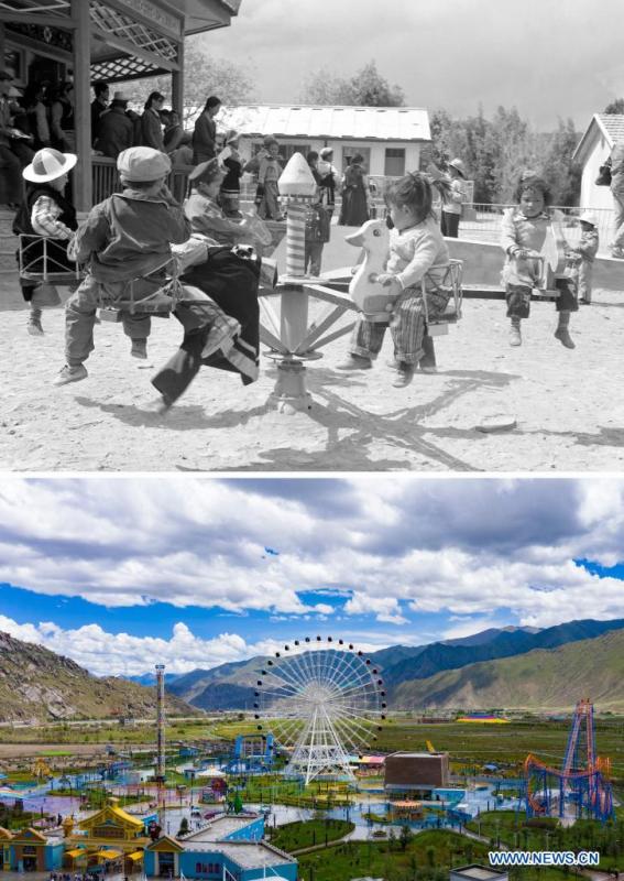 In this combo photo, the upper part taken by Cheng Xi shows children riding on a merry-go-round at a kindergarten in Xigaze in the 1980s; and the lower part taken by Zhang Rufeng on Aug. 9, 2021 shows a view of an amusement park in Lhasa, southwest China's Tibet Autonomous Region. On May 23, 1951, the Agreement of the Central People's Government and the Local Government of Tibet on Measures for the Peaceful Liberation of Tibet (17-Article Agreement) was signed, officially proclaiming the peaceful liberation of Tibet. The year 2021 marks the 70th anniversary of the historic event. (Xinhua)