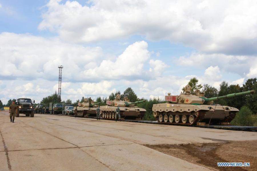 Military vehicles of the Chinese People's Liberation Army arrive in Moscow, Russia, Aug. 14, 2021. All of the Chinese military's 17 teams with weapons and equipment have arrived at their venues in Russia, Belarus, Uzbekistan and Iran on Tuesday for the upcoming International Army Games 2021. (Photo by Yu Xiaoping/Xinhua)