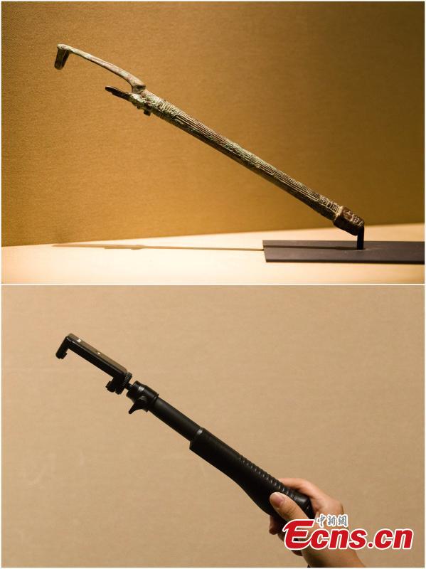 In this combo photo, the upper part shows the bronze horsewhip holder with the beast-face pattern from the Shang dynasty (1600 BC-1046 BC), and the lower part shows a selfie stick, in Taiyuan, North China's Shanxi Province, August 18, 2021. (Photo: China News Service/Zhang Yun)