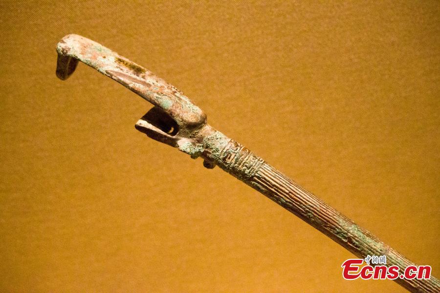 Photo taken on August 18, 2021, shows the bronze horsewhip holder with the beast-face pattern is exhibited at the Shanxi Museum in Taiyuan, North China's Shanxi Province. (Photo: China News Service/Zhang Yun)